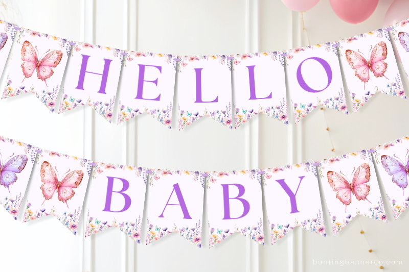 This printable banner includes “HELLO BABY” letter flags, plus matching butterfly image flags. The design features pretty butterflies and wildflowers. Use the image flags alongside the letters to frame your words, or hang them on their own as a decorative bunting for walls, dessert tables, gift tables, photo backdrops, or party entrances.