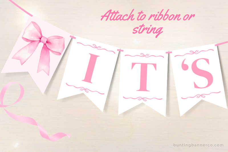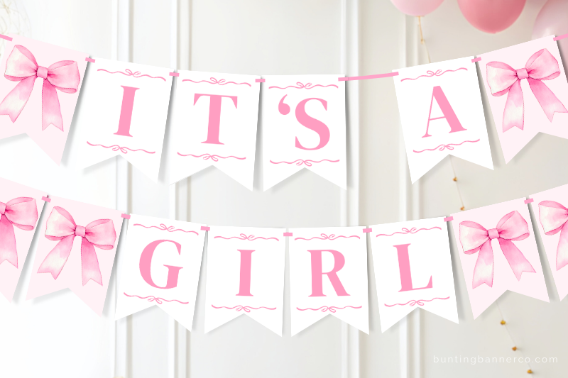 This printable banner includes “IT’S A GIRL” letter flags, plus a pink bow image flag. The design features pink letters with ribbon border and a watercolor ribbon pink bow. Use the image flags alongside the letters to frame your words, or hang them on their own as a decorative bunting for walls, dessert tables, gift tables, photo backdrops, or party entrances.