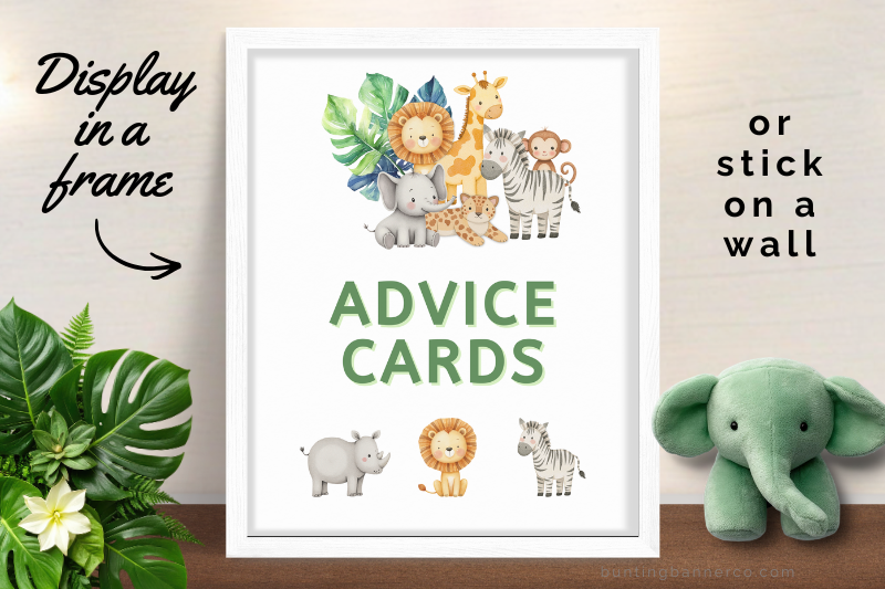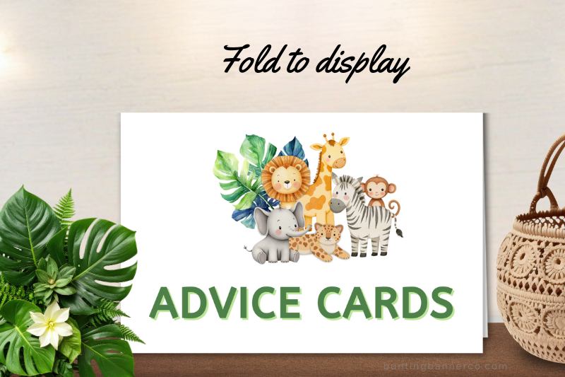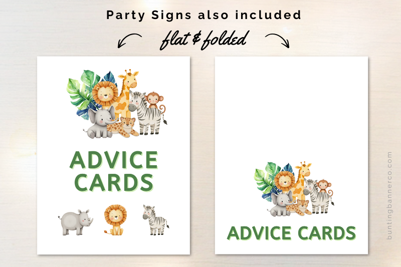 These safari baby shower advice cards feature cute lions, hippos, elephants, monkeys and jungle foliage to match the safari theme. You will also receive 2 party signs. One is flat and suitable for framing or sticking on a wall and the other one is for folding. Use the format you prefer.
