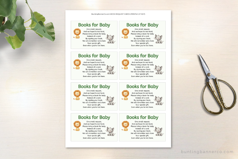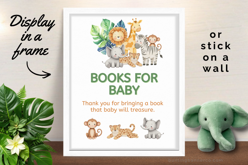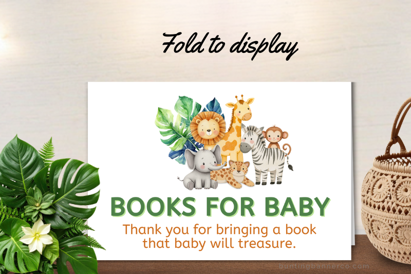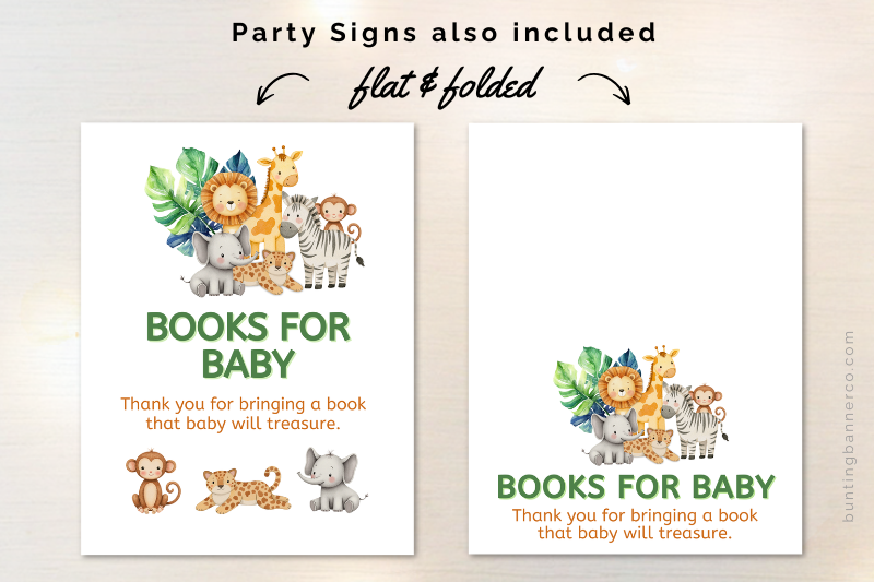 These safari baby shower books for baby cards feature cute lions and elephants to match the safari theme. You will also receive 2 party signs. One is flat and suitable for framing or sticking on a wall and the other one is for folding. Use the format you prefer.