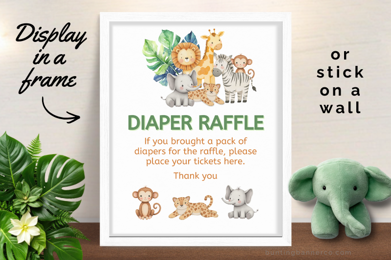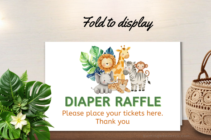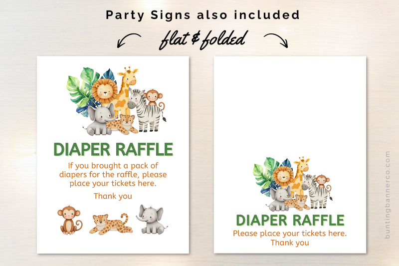These safari baby shower diaper raffle cards feature cute monkeys and giraffes to match the safari theme. You will also receive 2 party signs. One is flat and suitable for framing or sticking on a wall and the other one is for folding. Use the format you prefer.