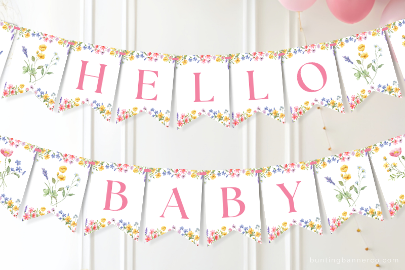 This printable banner includes “HELLO BABY” letter flags, plus matching themed image flags. The design features watercolor wildflowers and foliage. Use the image flags alongside the letters to frame your words, or hang them on their own as a decorative bunting for walls, dessert tables, gift tables, photo backdrops, or party entrances.